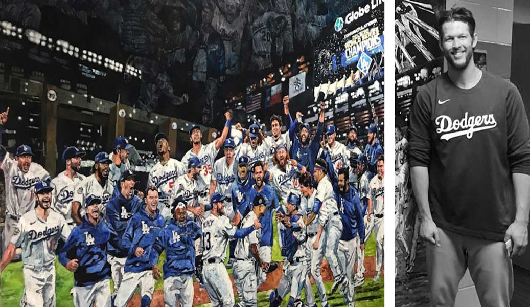 Posed along side painting of the world series celebration Dodger star of the winning team Clayton Kershaw.